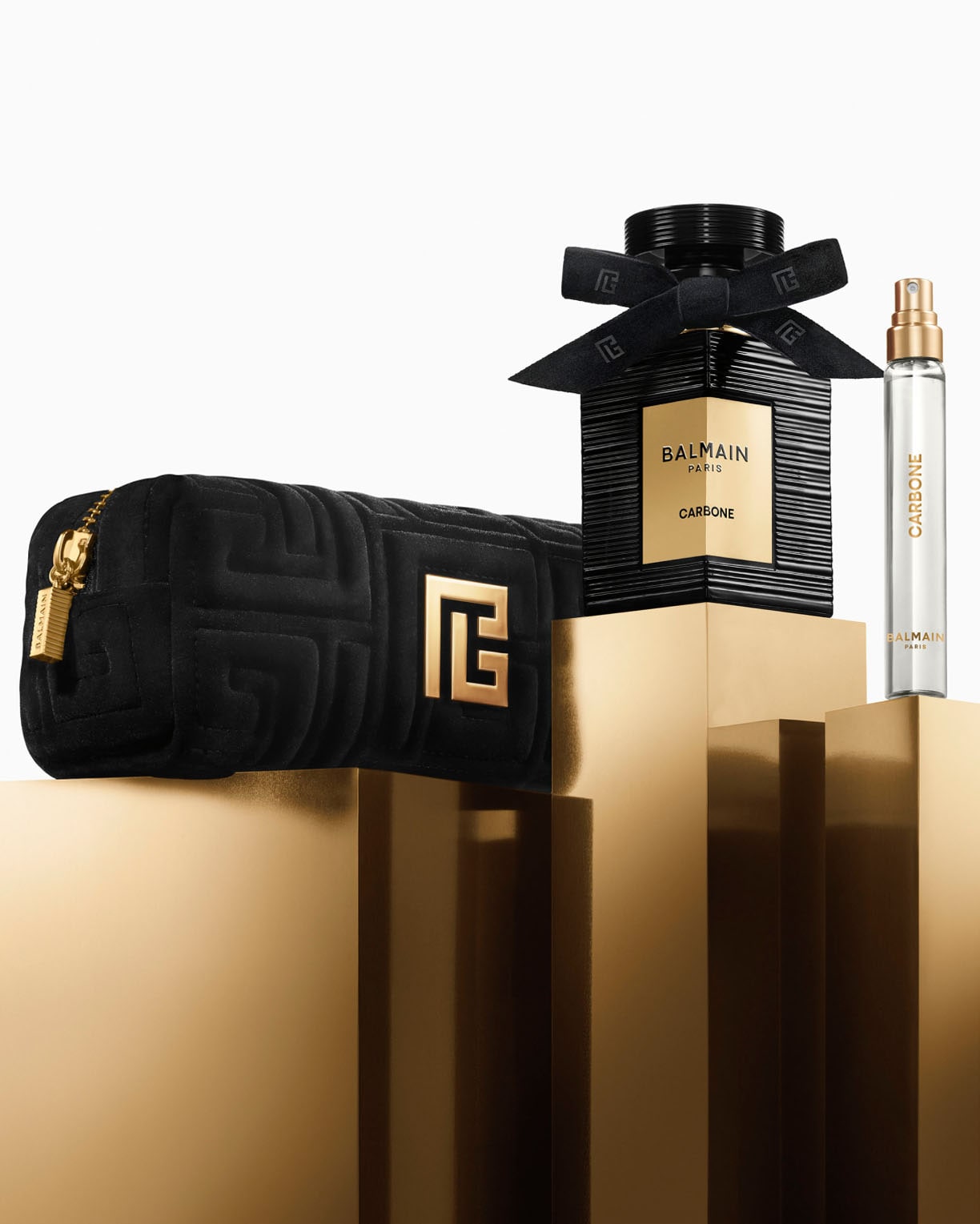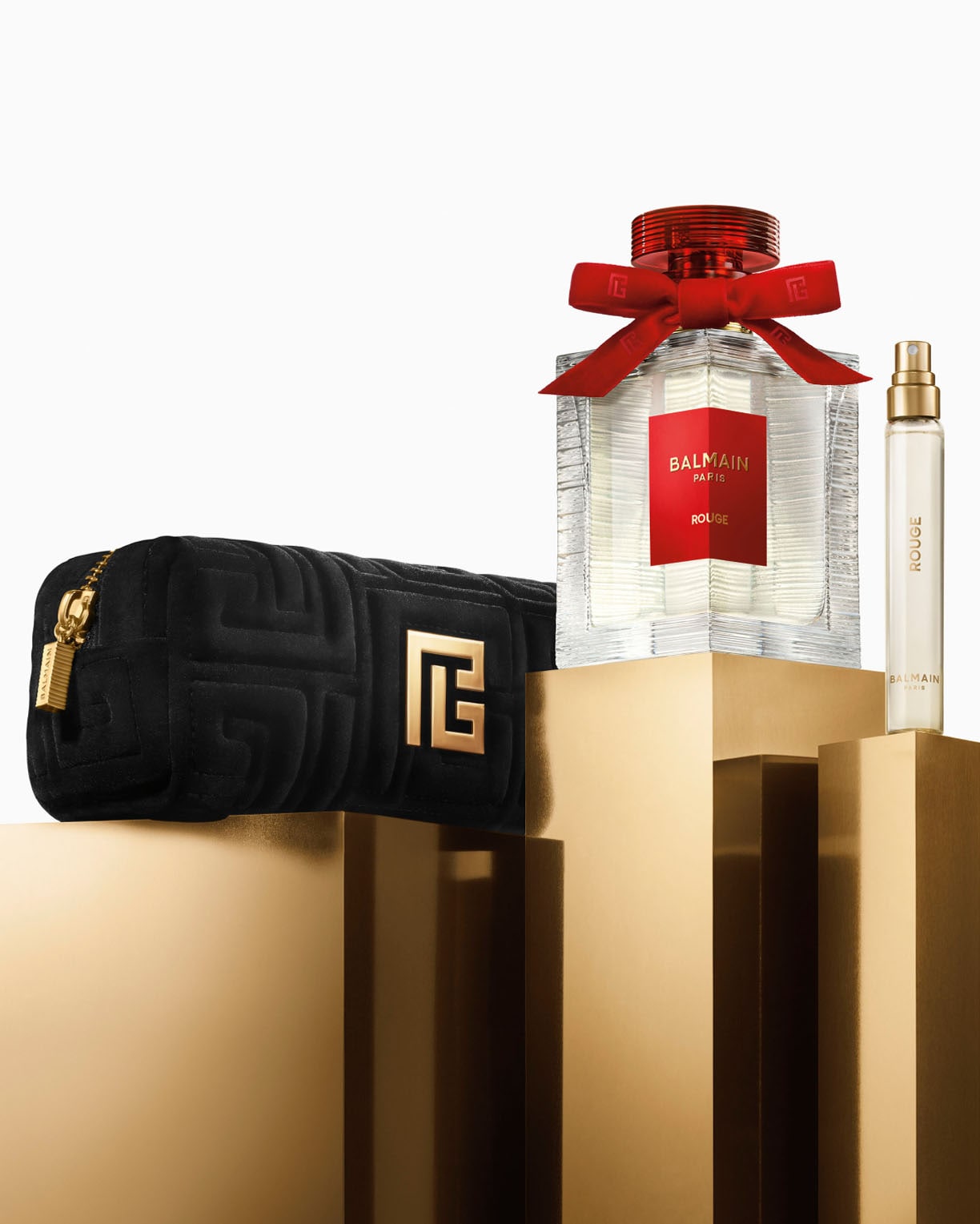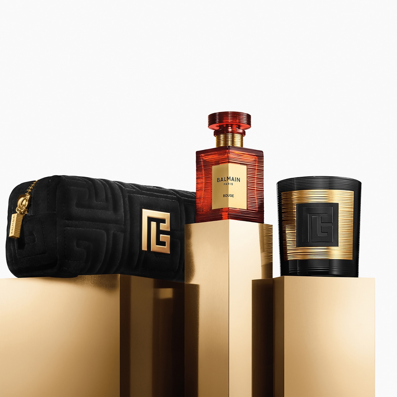 The addictive love of Rouge in a celebratory duo: Eau de Parfum and Scented Candle — to infuse LA’s magic hour on skin and at home. Complete with a signature Balmain pouch.