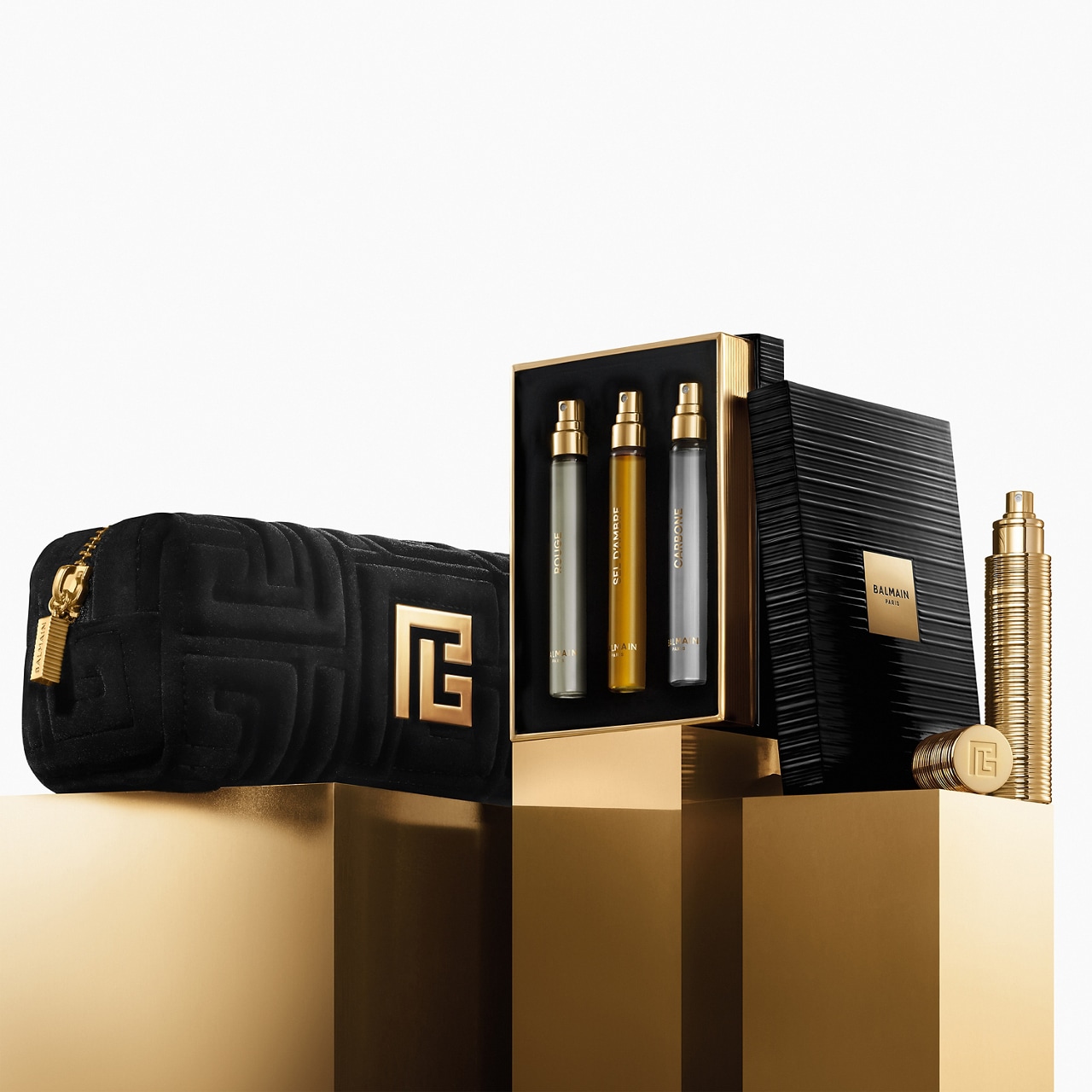 The gift of distinctive fragrances on the go—three bold Balmain eau de parfum in 10ml sprays, with a signature travel case atomizer and pouch.